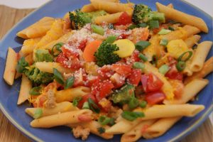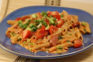 A rich tomato cream sauce with chunks of sausage, think a little sweet mixed with savory. Always a favorite with the kids.